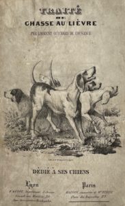 Lyon, F. Guyot, 1839. In-8, 13 x 21,5 cm, 2 ff., 226 pp., demi-chagrin brun à la Bradel avec coins, tête dorée, non rogné, couverture (reliure de la fin du XIXe siècle). Édition originale rare. Le traité de chasse du lièvre aux chiens courants, en vers, occupe les quarante-six premières pages de l’ouvrage.