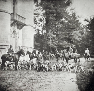 Pontpoint, 1887 [vers 1896]. In-plano, 38 x 48,5 cm, 106 ff., demi-maroquin vert, dos à nerfs orné de caissons et de fers cynégétiques dorés, tête dorée, non rogné (L. Carayon). Édition originale de cet album très rare, entièrement consacré à la vénerie, tiré à 150 exemplaires hors-commerce sur papier impérial du Japon.