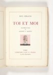 GERALDY, Paul. Toi et moi. Illustrations de André E. Marty. Paris, Piazza, [1939]. In-8 (205 x 143 mm) d'un frontispice, 163 pp., 100 compositions de Marty (dont le frontispice et la vignette sur le titre) coloriées au pochoir. Broché, couverture originale illustrée, étui original. Monod, 5290. Tirage limité à 3000 exemplaires, celui-ci un des 250 avec une suite de 35 planches en noir : 32 têtes de chapitre, couverture du titre, et frontispice. Bon exemplaire, boîte défraîchie.