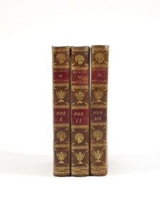I ; 2 ff.n.ch., 408 pp. pour le volume II ; 2 ff.n.ch., 243 pp. pour le volume III ; 2 ff.n.ch., 366 pp. pour le volume IV ; 2 ff.n.ch., 374 pp. pour le volume V ; 420 pp. pour le volume VI. Basane racinée, roulette dorée d'encadrement, dos lisse orné, tranches marbrées (reliure de l' époque).