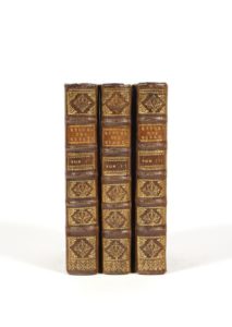 Châtelain, 1713. 3 volumes in-8 (169 x 107 mm) d'un frontispice gravé, 12 ff.n.ch., 396 pp., 22 ff.n.ch., 17 planches gravées (dont 8 dépliantes) pour le volume I ; frontispice gravé, 7 ff.n.ch., 384 pp., 8 ff.n.ch., 18 planches gravées (dont 7 dépliantes) pour le volume II ; frontispice gravé, 10 ff.n.ch., 394 pp., 12 ff.n.ch., 9 planches gravées (dont 7 dépliantes) pour le volume III. Veau moucheté, dos à nerfs orné, tranches rouges (reliure de l' époque).