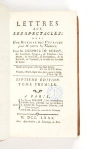Avocat au parlement de Paris et Académicien, Desprez de Boissy livre ici une critique rationnelle et argumentée non seulement contre le théâtre et les spectacles mais surtout contre la fréquentation et les plaisirs qu'on va y chercher.