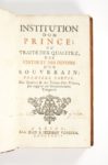 DUGUET, Jacques-Joseph, abbé Institution d'un prince : ou Traité des qualitez, des vertus et des devoirs d'un souverain. Première [-quatrième] partie. Leyde, Jean & Herman Verbeek, 1739. 4 volumes in-12 (156 x 95 mm) de 19 ff.n.ch., 368 pp. pour le volume I ; 9 ff.n.ch., 368 pp. pour le volume II ; 13 ff.n.ch., 659 pp. pour le volume