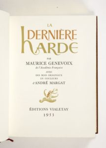 Genevoix, Maurice La Dernière harde. Avec des bois originaux en couleurs d'André Margat. Paris, Éditions Vialetay, 1953. Fort volume in-4 (324 x 248 mm) de 319 pp., 5 ff.n.ch. Maroquin havane janséniste, dos à nerfs, doublure et garde de moire verte, tête dorée, couverture originale illustrée conservée, étui assorti (Ad. Lavaux).