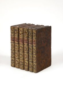 II ; 2 ff.n.ch., 331 pp., 13 ff.n.ch. pour le volume III ; 2 ff.n.ch., 351 pp., 11 ff.n.ch. pour le volume IV ; 2 ff.n.ch., 309 pp., 9 ff.n.ch. pour le volume V ; 2 ff.n.ch., 207 pp., 7 ff.n.ch. pour le volume VI. Basane marbrée, dos à nerfs orné, tranches rouges (reliure de l'époque).