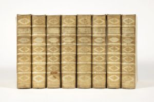 VIII (la planche 99 est par erreur reliée à la fin du volume VII). Vélin ivoire, plats ornés d'un décor à la Du Seuil, dos à nerf orné, tranches jaspées (reliure de l' époque).