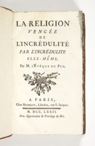 [LE FRANC DE POMPIGNAN, Jean-Jacques, marquis] le Religion vengée de l'incrédulité par l'incrédulité elle-même. Paris, chez Humblot, 1772. In-12 (164 x 100 mm) de IV, 357 pp., 1 f.n.ch.