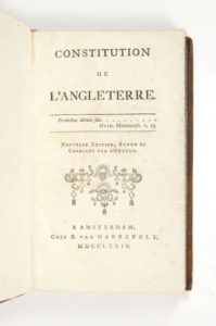 LOLME, Jean Louis de Constitution de l'Angleterre. Nouvelle édition, revue et corrigée par l'auteur. Amsterdam, E. van Harrevelt, 1774. In-12 (195 x 123 mm) de 3 ff.n.ch., 250 pp. Veau tacheté, dos à nerfs orné, tranches marbrées (reliure de l' époque).