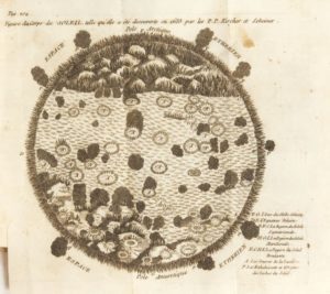 Belle édition, illustrée de deux planches ‘cosmographiques' figurant le système solaire et une carte du soleil inspirée de celles de Kircher et de Scheiner.