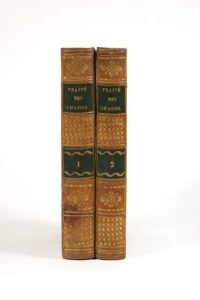 JOURDAIN, François Xavier Félix Traité général des chasses à courre et à tir. Paris, Audot, 1822. 2 volumes in-8 (199 x 123 mm) de 2 ff.n.ch., XIII, 311 pp. (et les pp. 51/52 bis), 1 f.n.ch. (errata), 25 planches numérotés (1-24, et 12 bis. Pas de planche 21, mais il y a 2 planches distinctes au chiffre 22), 12 pp. de musique gravées pour le volume I ; 2 ff.n.ch., 321 pp., 1 f.n.ch. (errata), planches numérotées 25 à 35 (dont une dépliante en frontispice). Basane racinée, dos lisse orné, tranches bleues jaspées rouge (reliure de l' époque).