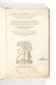 Estienne, Henri Concisiones sive orationes Graecis et Latinisque historicis excerptae. [Graece & Latine.] Sans lieu [Genève], Henri Estienne, 1570. In-folio (314 x 203 mm) de 10 ff.n.ch., 278 pp. [recte 288], 2 ff.n.ch., 194 pp. Vélin moucheté, dos à nerfs (reliure du XVIIème siècle).