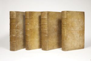 Estienne, Henri Thesauraus Graecae linguae [Graece.] [Genève], Henri Estienne, 1572. 5 tomes en 4 volumes in-folio (343 x 214 mm) de 20, XX pp., XXIV col., 1946 col., (dernier blanc ôté par le relieur) pour le tome I; XII col., 1700 col. (avec les feuillet blanc entre col. 1592/93) pour le tome II; 1793 col. pour le tome III; faux-titre et 834 col. pour le tome IV; 1766 col. (mal chiffrées 1746: la numérotation des colonnes 17-32 et 969-972 a été répétée); 212 col. (les feuillets blanc après les colonnes respectives 228, 1746, 212 ont été ôtés par le relieur) pour le tome V. Vélin ivoire, dos avec titre et tomaison dorées, tranches rouges (reliure du XVIIIème siècle).