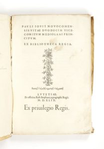 Giovio, Paolo Vitae duodecim vicecomitum Mediolani principum. Paris, Robert Estienne, 1549. In-4 (226 x 168 mm) de 199 pp.; vélin souple à rabais (reliure de l' époque).