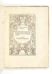 Paris, Henri Estienne, 9 décembre 1517. In-folio (277 x 201 mm) de 66 ff.ch. (mal chiffré 56), titre dans un bel encadrement gravé sur bois, quelques gravures sur bois dans le texte. Demi-vélin, tranches marbrées (reliure du XVIIIème siècle).