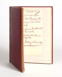 In-12 de VII pp., 118 pp., (1) f. d'errata: maroquin rouge, dos à nerfs orné, double filet doré encadrant les plats, coupes filetées or, encadrement intérieur de même maroquin orné de filets dorés, doublures et gardes de soie dorée, tranches dorées sur témoins, couverture conservée (E. & A. Maylander).