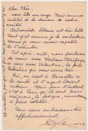 Jolie lettre dans laquelle Eluard évoque son amitié commune avec Valentine Hugo ; il félicite Théo pour son dernier recueil de poésies, "Andromède éblouie" ; Vous êtes un ange. Nous sommes imbibés de la douceur de votre amitié. Andromède éblouie est très belle. Tout y est (…) comme je vous savais capable de l’exécuter. Cet après-midi, nous parlerons de vous avec madame Thirifays, ce soir avec Valentine, la forte Valentine qui vous aime bien (…). Et répondant à l’invitation de Théo Léger ; Oui, on irait à Bruxelles, si la santé et l’argent étaient certains (…).