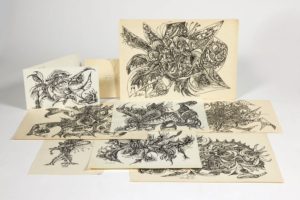 Détail: (1962): dessin à l'encre de Chine (11,9 x 17,2 cm) (1966): dessin à l'encre de Chine (22,5 x 17,2 cm) (1966): dessin à l'encre de Chine (21,4 x 27,3 cm) (1966): dessin à l'encre de Chine (21,6 x 31,9 cm) (1966): 2 dessins à l'encre de Chine (24,8 x 35,7 cm) dont un dédicacé à Robert Altmann (1967): carte de voeux (12,9 x 21,1 cm) (1967): dessin à l'encre de Chine (23,3 x 27,2 cm) (1967): dessin à l'encre de Chine (24,9 x 35,6 cm).