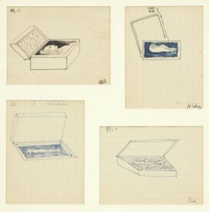 Le premier dessin, par André Breton, figure une boîte ouverte dans laquelle se trouve un portrait de femme.