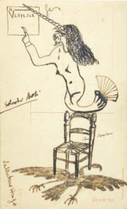 Dessin à l'encre signé par tous les participants sur une carte postale (14 x 8,8 cm).