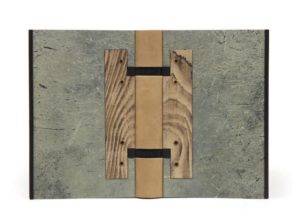 In-12: dos de veau beige, plats semi-souples en vachette gris bleuté bordés d'une bande de veau noir, aux mors bande à redent de vachette imprimée du brûlé des nervures d'une planche de pin fixée par des oeillets, doublures et gardes de vachette gris bleuté, non rogné, couverture et dos conservés, chemise, étui (Jean de Gonet, 1985).