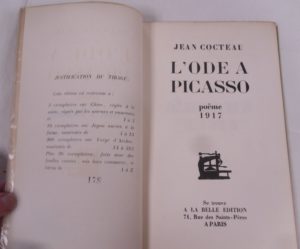 COCTEAU (Jean) — L'ode à Picasso, poème 1917. — E.O. – Paris, La belle édition, 1919 – in-8 étroit  : broché – Tirage à 339 exemplaires, celui-ci n°178/300 sur vergé d'Arches . (dos jauni) Talvart et Place III, 180 n°7.