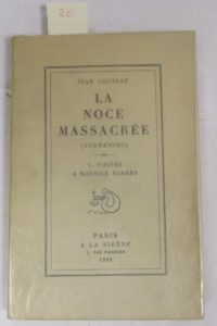 "COCTEAU (Jean) — La noce massacrée (souvenirs) I visites à Maurice Barrès. — E.O. – Paris, La Sirène, 1921 – in-8  : broché, n.c. – Tirage de luxe à 340 exemplaires,celui-ci n°VIII/XL sur vergé d'Arches.