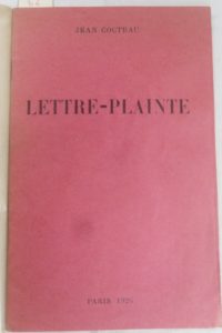 COCTEAU (Jean) — Lettre-plainte – Paris, Roland Saucier (Imprimerie centrale de l’Ouest), 1926 – in-8  : 4 p. - Exemplaire n°18/25 sur vergé d'Arches – Ex-libris Gérard Oberlé.