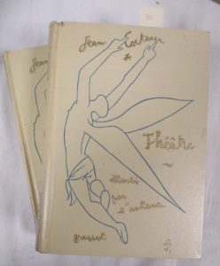 COCTEAU (Jean) — Théâtre illustré par l'auteur – Grasset, 1957 – 2 vol. in-4 : cartonnage éditeur illustré, sous étui papier commun.