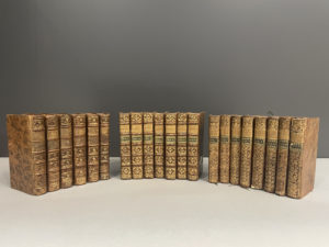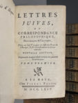 havane mouchetée époque, dos à 5 nerfs, pièces de titre et de tomaison blondes et vertes, caissons ornés, tranches rouges (défauts d'usage dont 3 coiffes découvertes et des coins émoussés, rares rousseurs). Nouvelle édition augmentée de ce recueil si caractéristique de l'oeuvre de Boyer d'Argens, offrant un regard critique sur la société du temps. On joint, du même : - Lettres chinoises, ou Correspondance philosophique, historique et critique, entre un Chinois voyageur à Paris & ses correspondans à la Chine, en Moscovie, en Perse et au Japon. A La Haye, chez P. Paupie, 1769. 6 volumes in-12, basane havane marbrée époque, dos à 5 nerfs, pièces de titre et de tomaison, tranches rouges (défauts dont dos frotté, 3 coiffes usées, accrocs à des coins ; mq. 1 coin en marge du premier titre, taches t.3 p. 215-216, des f. jaunis au t.6). Nouvelle édition augmentée de ce recueil paru pour la première fois en 1739 et dont le succès a perduré jusqu'à la fin du XVIIIème siècle. Etiquette moderne de la congrégation des Prêtres de Saint-Sulpice. On Joint, du même : - Lettres juives, ou Correspondance philosophique, historique et critique, entre un Juif voyageur en différens états de l'Europe, & ses correspondants A La Haye, chez P. Paupie, 1764. 8 volumes in-12, basane havane mouchetée époque, dos lisse orné, pièces de titre et de tomaison (défauts dont des coins et coiffes usés, le dernier vol. très frotté avec trav. de vers au dos). Nouvelle édition augmentée. Le tome 8 renferme une Table générale. Soit 21 volumes.
