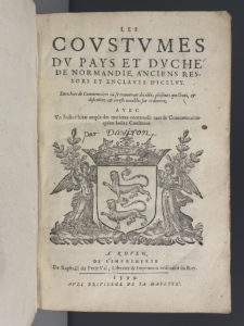 [Livre du XVIe siècle]. [Coutume. Normandie. 1599]. [AVIRON (Jacques Le Batelier d')]. Les coustumes du pays et duché de Normandie, anciens ressors et enclaves d'iceluy. A Rouen, de l'Impr. de Raphaël du Petit Val, 1599. In-4, [6] f., 282 p., [8]...