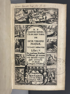 BONIFACIO (Juan). De Divae Virginis Mariae vita et miraculis libri V... Coloniae, Sumpt. B. Gualtieri, 1610. In-8, [8] f. (dont le titre gravé), 836 p., [3] f., reliure monastique pleine peau de truie sur ais de bois, dos à 4 nerfs et muet, chaque...