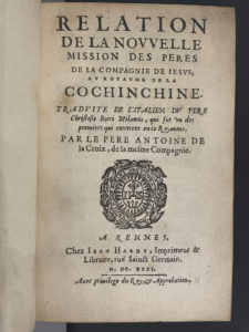 BORRI (Cristoforo). Relation de la nouvelle mission des pères de la Compagnie de Jésus au royaume de la Cochinchine. A Rennes, chez J. Hardy, 1631. In-8, [4] f., 222 p., [1] f. (privil)., basane fauve racinée tout début XIXe s., dos lisse et...