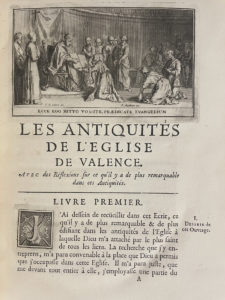 CATELLAN (Jean de). Les antiquités de l'Église de Valence À Valence, chez J. Gilibert, 1724. In-4, [3] f., 366 p., [1] f. (privil.), veau brun époque, dos à 5 nerfs, pièce de titre grenat, caissons ornés, roulette dorée aux coupes, tranches...