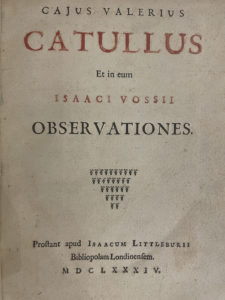 CATULLE. Cajus Valerius Catullus et in eum Isaaci Vosii Observationes. [Londres], prostant apud I. Littleburii, 1684. In-4, [2] f., 343 p. (mal chiffré 327), [15] f. (index, errata), velin ivoire époque, dos lisse, titre à l'encre (une piq. de ver...