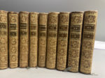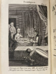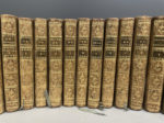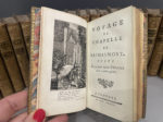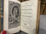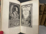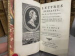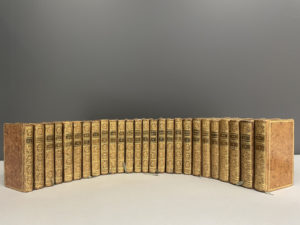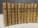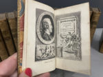 pièces de titre et de tomaison, triple filet doré bordant les plats, filet doré aux coupes, tranches dorées. Très légers frottements, bel ensemble. CHAPELLE, BACHAUMONT. Voyage 1782. 1 vol., frontispice. - DUCLOS. Considération sur les moeurs de ce siècle. 1784. 1 vol., portrait. - FONTENELLE. OEuvres. 1784-1785. 7 vol., 1 portrait, 1 planche dépliante. - GESSNER. OEuvres. [Vers 1785]. 3 vol., 1 portrait, 3 titres gravés, 14 vignettes, texte sur papier azuré. - HAMILTON. Mémoires du comte de Grammont. 1781. 2 vol., 1 portrait (mouill. très pâle au portr.). - LA BRUYÈRE. Les caractères 1784. 2 vol. (un 3ème a paru), 1 portrait. - [LESAGE]. Les aventures plaisantes de Gusman d'Alfarache. 1783. 2 vol., 2 frontispices. - MARMONTEL. Contes moraux. 1780. 2 vol. (un 3ème a paru), titre gravé répété, 1 portrait, 16 vignettes. - MONTESQUIEU. Lettres persanes, suivies du Temple de Gnide. 1784. 2 volumes, 1 portrait gravé. - MONTESQUIEU, De l'esprit des loix. 1787. 4 vol.