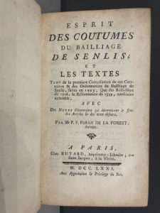 lisse, titre à l'encre (brunissures, des cahiers un peu déréglés). « Edition nouvelle, corrigée & accomodée pour l'utilité du public ». Elle contient les annotations de Charles Du Moulin. On joint : PIHAN DE LA FOREST (P.F.). Esprit des coutumes de Senlis, et les textes A Paris, chez Butard, 1771. In-12, XXIX-534 p., [2] f., veau havane moucheté époque, dos à nerfs orné, pièce de titre grenat, tr. rouges (coiffes arrachées, 1 coin usé). Soit 2 volumes
