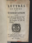 sur Saône, chez la Vve de P. Cusset, 1665. In-4, [19 (sur 20 ?)] f., 538 p., [3] f., vignette gr. sur cuivre au titre, veau brun époque, dos à 5 nerfs, titre doré, caissons ornés, mors fendus, coiffes et coins usés, rousseurs, trav. de vers touchant qq. lettres aux ff. limin., puis simple galerie en marge ; un f. de table pourrait manquer au début). Signatures anciennes sur les gardes, notes anciennes (chanson à boire) au contreplat inférieur. On joint : [BAUDOT (François)]. Lettres en forme de dissertation sur l'ancienneté de la ville d'Autun et sur l'origine de celle de Dijon. A Dijon, chez Ressayre, 1710. In-12, [4] f., 127 p., veau havane marbré époque, dos à 5 nerfs orné, pièce de titre maroquin grenat, tranches rouges (défauts dont une coiffe découverte, mors sup. fendu en tête, des marges jaunies). Ouvrage illustré de 12 planches gravées sur cuivre montrant notamment des monuments antiques. Soit 2 volumes.