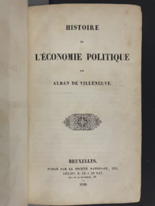recueil d'études, que l'auteur des Forces productives et commerciales de la France a voulu d'un format et d'un prix abordable aux « petits propriétaires » et « petits industriels » qu'il comptait toucher. L'ouvrage se compose de 5 traités indépendants : I. Petit tableau des forces productives de la France, depuis 1814 ; II. Le petit propriétaire français ; III. Le petit fabricant français ; IV. Le petit commerçant français ; V. L'ouvrier français. On joint : - VILLENEUVE-BARGEMONT (Alban de). Histoire de l'économie politique. Bruxelles, De Mat, 1839. In-8, [2] f., 682 p., demi-chagrin rouge époque, dos à nerfs orné, auteur et titre dorés, tr. marbrées (mors fendus, coins émoussés). Première édition de cette synthèse historique parue dans la presse entre 1835 et 1837. Soit 2 volumes