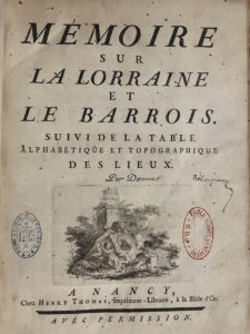 [Robespierre]. [DURIVAL (Nicolas Luton)]. Mémoire sur la Lorraine et le Barrois. Suivi de la table alphabétique et topographique des lieux. A Nancy, chez Henry Thomas, [1753]. In-4, [1] f., XV-601 p., [1] f. (corrections), basane havane mouchetée...