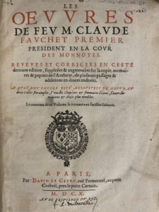 FAUCHET (Claude). Les oeuvres de feu M. Claude Fauchet premier président en la Cour des Monnoyes... revues et corrigées.... A Paris, chez D. le Clerc et J. de Heuqueville, 1610. 3 parties en un volume in-4, [12] f., ff. 1-196, [8] f., ff. 196-320,...