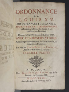FURGOLE (Jean-Baptiste). Ordonnance de Louis XV... pour fixer la jurisprudence sur la nature, la forme, les charges et les conditions des donations, donnée à Versailles au mois de février 1731, avec des observations... À Toulouse, chez J.-F....