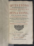Forest, 1733. Trois parties en un volume in-folio, [5] f., 195 p., [3] f., 115 p., [2] f., 208 p., basane brune époque, dos à 6 nerfs, pièce de titre grenat, caissons ornés, tranches rouges (coiffes découvertes, accidents aux plats, papier bruni, rares défauts en marge). Ouvrage composé à la suite d'une question proposée par le chancelier d'Aguesseau au Parlement de Toulouse en 1729, à propos des donations. Jusrisconsulte et avocat audit Parlement, Jean-Baptiste Furgole (1690-1761) y apporte ici une réponse qui contribua à établir sa réputation. (Dupin, 1150).