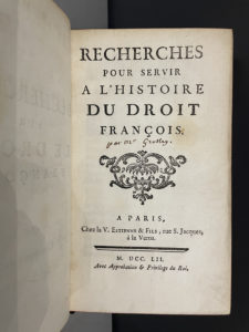[GROSLEY (Pierre-Jean)]. Recherches pour servir à l'histoire du droit françois. A Paris, chez la Vve Estienne & fils, 1752. In-12, [2] f., VIII p., [2] f., 250 p., [3] f., basane fauve mouchetée époque, dos à 5 nerfs, pièce de titre maroquin...