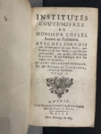 grenat, tranches rouges (coins et coupes frottés, rouss. modérées). Édition originale. La fin de l'ouvrage renferme, pages 183 à 250, les « Recherches sur la noblesse utérine de Champagne ». Provenance : Jean-Baptiste Comparot, sieur de Longsol, 1741-1834, avocat, conseiller au bailliage de Troyes (ex-libris estampillé et manuscrit). On joint : LOISEL (Antoine). Institutes coutumières avec des renvois aux ordonnances de nos rois A Paris, chez N. Gosselin, 1710. 2 vol. in-12, veau brun époque, dos à 5 nerfs, pièce de titre maroquin grenat, tomaison dorée, tranches rouges (accrocs à 3 coiffes et 2 coins, rousseurs, mouillure claire que qq. pages du t.1). Première édition comprenant les notes d'Eusèbe de Laurière. « On regarde cet ouvrage comme le meilleur de ceux que De Laurière a écrit » (Dupin, 1162). Soit 3 volumes