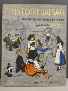 polychrome d'après une composition de Hansi, et au plat inférieur d'une vignette de même montrant la cathédrale de Strasbourg (un coin frotté, charn. int. fendue, dos et plat inf. très légèrement insolés). Mention manuscrite au faux-titre : « 1er janvier 1915, dans l'espoir de lire ce livre à Strasbourg, bientôt ».