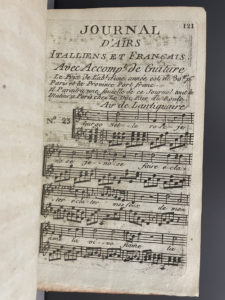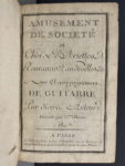année]. A Paris, chez de La Chevardière ; à Lyon, chez Castaud, [1768]. In-8, [2] f. (titre, table), 228 p., velin vert ancien, dos lisse, titre et tomaison dorés, tranches rouges (accroc à la coiffe de tête, qq. ff. en ressaut, lég. bruniss.). Troisième année de cette publication entièrement gravée, réunissant en 52 livraisons autant de morceaux avec le texte et la musique notée. Ce recueil parut de 1764 à 1810. Titre orné d'une vignette et dans un encadrement dessiné et gravé par Moreau. Provenance : Mlle d'Estourmel (ex-libris manuscrit de l'époque). On joint : [Musique]. Recueil factice gravé, fin XVIIIe siècle, réunissant 70 airs avec musique notée ; les éditeurs parisiens sont notamment Frère, Le Duc, Savigny, Mlle Le Beau, Melle Borrelly, Imbault. En 1 vol. in-8, demi-basane fauve époque, dos lisse, pièce de titre, filets dorés, tr. rouges (défauts d'usage, lég. saliss., un coin mq. à une page, le texte reproduit à la main). Soit 2 volumes