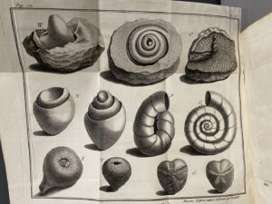 cette province et en Touraine Avec de nuvelles assertions sur la végétation spontanée des coquilles A Paris, chez la Vve Duchesne et la Vve Tilliar, 1776. In-8, XLVIII p., p. [XXXVII]-LVI, 171 p., [2] f. (errata, approb.), pl., basane havane marbrée époque, dos à 5 nerfs, caissons ornés, pièce de titre fauve, filet doré aux coupes, tranches marbrées (accroc négligeable sur une coiffe, une pl. réparée dans un pli). Edition originale de ce recueil d'étude des antiquités de la Touraine et du Poitou, contenant en particulier des descriptions de coquilles fossiles. L'auteur correspondit avec Voltaire à propos de cette partie de ses travaux, et trois lettres que le philosophe lui adressa sont publiées au début de l'ouvrage. L'illustration se compose de 5 planches dépliantes gravées sur cuivre : 2 cartes et 3 planches de fossiles.