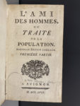 MIRABEAU (Victor Riquetti de). L'ami des hommes, ou traité de la population. Nouvelle édition corrigée. Avignon, s.n., 1758-1759, 4 parties en 4 vol. in-8, VIII-220 p., [1] f. + 304 p., [1] f. + 301 p. + [4] f., 160-252 p., veau havane moucheté...