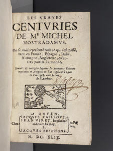 tête). Rare première édition rouennaise des Centuries de Nostradamus. Illustrée d'une vignette astrologique gravée sur bois au titre. (Dorbon 3272). Provenance : Delahaye (signature ancienne au titre et répétée p.102).