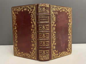 filet et d'une dentelle dorés, roulette dorée aux chasses et coupes, tranches dorées (petit accroc à la coiffe de tête, 3 coins frottés). Charmante reliure ornée aux plats de petits dauphins et insectes en fleurons.